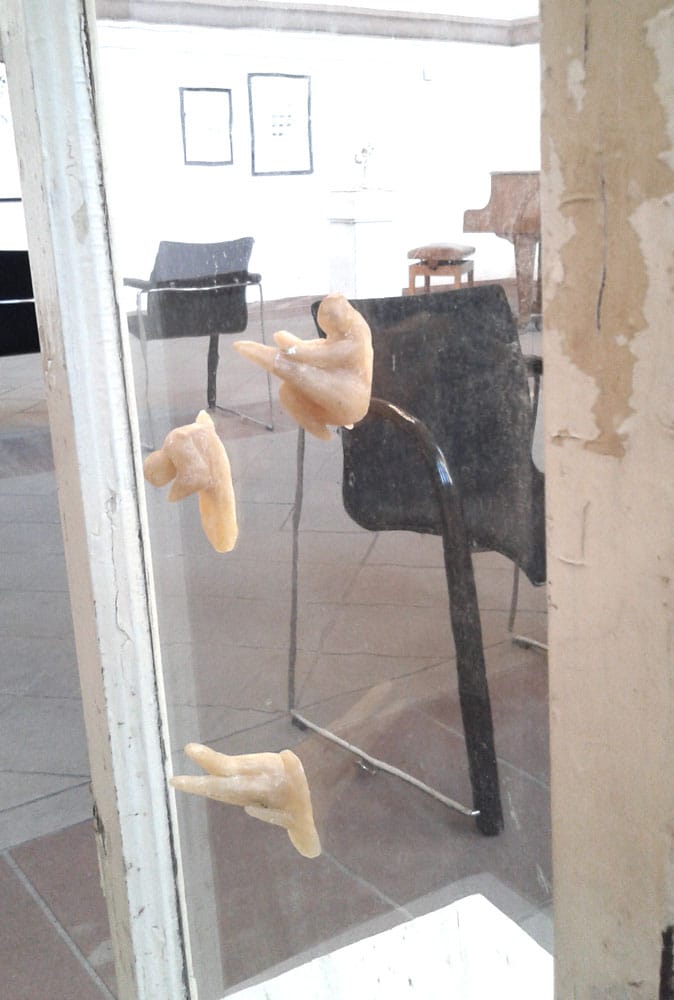 Regen (R)tautologisch, fatalistisch, fabelhaft, fatal3R16 Fällt der Regen 50 × 70 cm Linoldruck Auflage 15 2014 R15 Regen bis zum Hals 50 × 70 cm Linoldruck Auflage 15 2014 R07 Regen 50 × 70 cm Tusche 2014 R08 Freifall 1 40 × 50 cm Tusche 2014 R09 Freifall 2 40 × 50 cm Tusche 2014 R10 Freifall 3 40 × 50 cm Tusche 2014 R13 Why 40 × 50 cm Tusche / Gouache 2014 11 Ich werde nass 50 × 70 cm Tusche / Gouache / Papierschnitt 2014 R01 – R06 Zyklus Er und der Regen Je 40 × 50 cm Tusche / Gouache 2014 R20 Splash Knochen / Tusche / Holz 2014 R19 Knock, knock ca. 67 x 41 x 7 cm Fenster / Bienenwachs 2014
